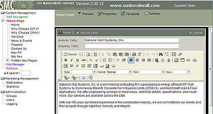 National Wall, a concrete wall systems company, had contracted another firm to build their first website just last year, but they soon needed control to update the site with more information. In reviewing their website, we could see they had more areas for improvement, but getting them control was first and foremost.